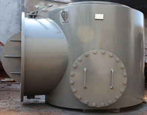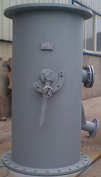 | 收球網(wǎng)是膠球清洗系統(tǒng)中的關(guān)鍵設(shè)備,它安裝于凝汽器出水管段上,攜帶海綿膠球的冷卻水,通過(guò)凝汽器管束,它的作用是把膠球從冷卻水中分離出來(lái),且必須具備不漏球、不卡球的性能,球被回收后由引出管從收球網(wǎng)引出打回裝球室。我廠生產(chǎn)的收球網(wǎng)是目前最先進(jìn)的結(jié)構(gòu)形式,它的柵網(wǎng)板可以轉(zhuǎn)動(dòng);在膠球裝置投運(yùn)時(shí),網(wǎng)板處于收球位置,在不投運(yùn)清洗裝置時(shí),該柵網(wǎng)板可以旋轉(zhuǎn)到與水流方向一致的位置;既減少水阻又起到清除柵板上雜物的作用。網(wǎng)板的轉(zhuǎn)動(dòng)定位由電動(dòng)執(zhí)行機(jī)構(gòu)執(zhí)行(小型收球網(wǎng)為手動(dòng)控制)。柵網(wǎng)板到位與否是保證收球網(wǎng)收球效率的關(guān)鍵之外。具體形式有SD(單網(wǎng)片)、 SF(A字分流式)、SLD(漏斗型)型。一、SD型收球網(wǎng)型號(hào):1、 結(jié)構(gòu)特點(diǎn) SD型收球網(wǎng)由一個(gè)網(wǎng)板、一個(gè)操作軸、導(dǎo)流翼、外殼、操作機(jī)構(gòu)(電動(dòng)執(zhí)行機(jī)構(gòu))等組成。網(wǎng)板由不銹鋼條制成,可以轉(zhuǎn)動(dòng),當(dāng)網(wǎng)板靠在外殼壁上時(shí)為收球位置,轉(zhuǎn)動(dòng)一定角度到達(dá)反洗位。2、 工作原理 ?、?nbsp;收球位置:當(dāng)系統(tǒng)運(yùn)行時(shí),網(wǎng)板處于收球位置,此時(shí)網(wǎng)板四周緊貼外殼內(nèi)壁,膠球通過(guò)網(wǎng)板阻攔在一側(cè)匯集,經(jīng)引出管,被一小股水流攜帶吸入膠球輸送泵,這樣,膠球又被送回裝球室進(jìn)行再循環(huán)使用?! 、?nbsp;反洗位置:網(wǎng)板前后壓差達(dá)一定值時(shí),操作網(wǎng)板至反洗位(收球后進(jìn)行),此時(shí)積存在網(wǎng)板上的雜物,就會(huì)被冷卻水流沖洗并攜帶走。3、 主要技術(shù)參數(shù) 收球率:≥95% 水 阻:≤300mmH2O 網(wǎng)板板條間距:7mm 電 源: 380V4、設(shè)備外形與結(jié)構(gòu)尺寸 |